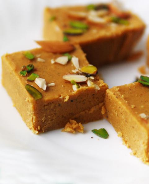 Earthy warm bengal gram barfi, topped with nuts, is all it takes to make one finish an entire box and still ask for more.