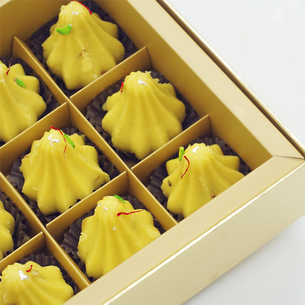 Relish this classic kesar/saffron modak (truffle), with succulent center filled with nuts and sugary syrup.